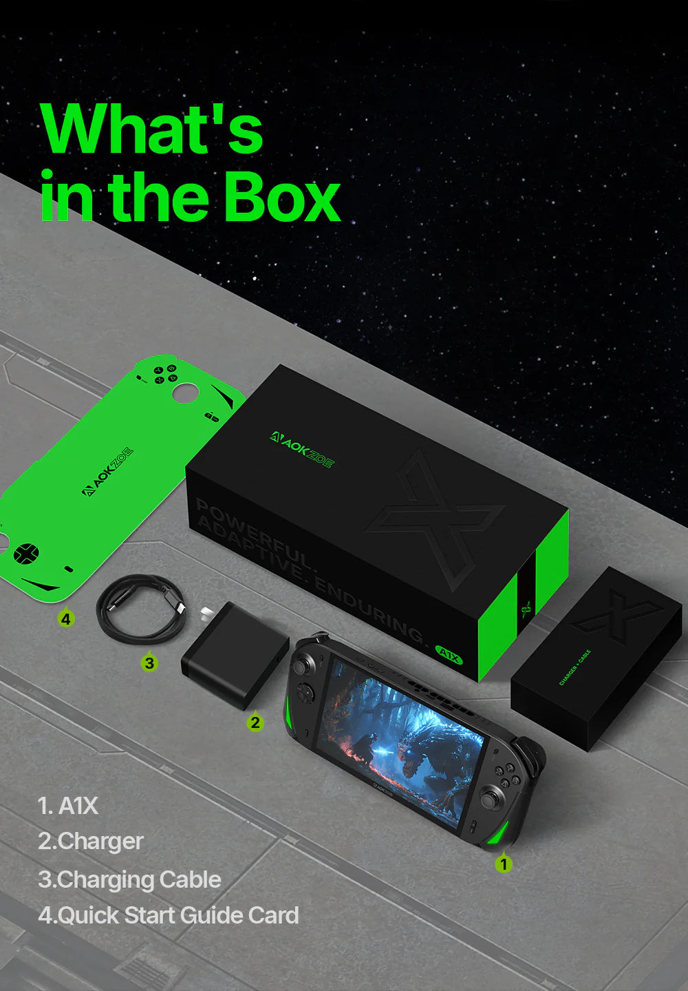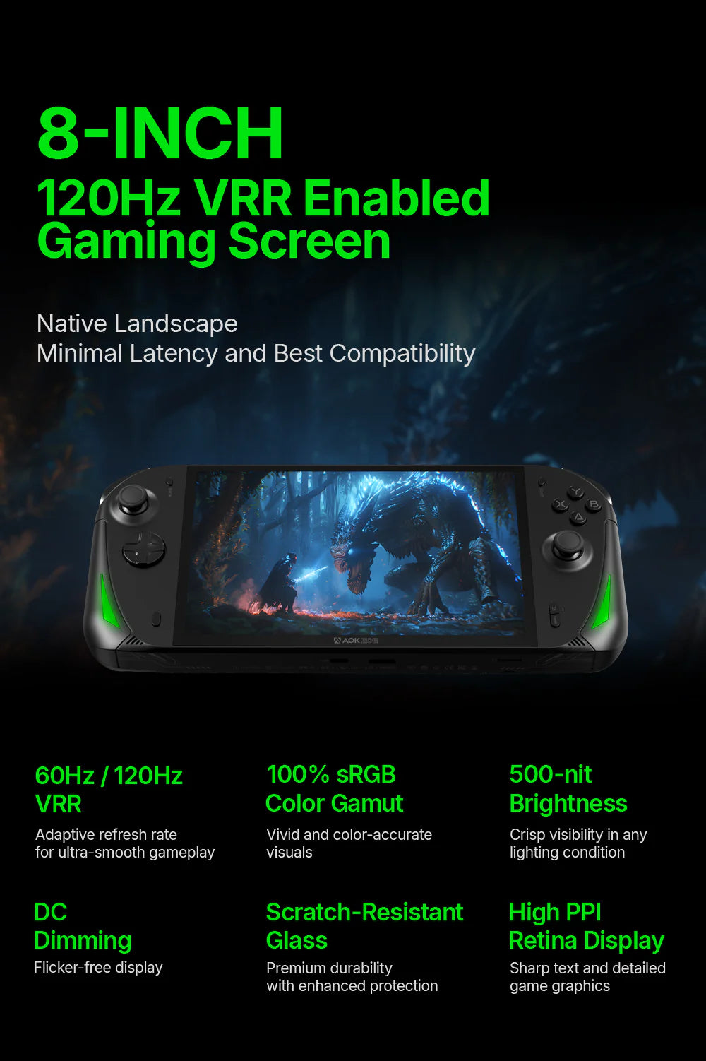 The AOKZOE A1X is an 8-inch handheld gaming device known for its powerful hardware and impressive display. It features an AMD Ryzen 9 HX 370 processor with integrated Radeon 890M graphics, up to 64GB of LPDDR5X RAM, and up to 2TB of NVMe SSD storage. The 8-inch display boasts a 1920x1200 resolution, 120Hz refresh rate, VRR (Variable Refresh Rate) support, and 100% sRGB color gamut coverage. It also includes a 72.7Wh battery, Wi-Fi 6E, Bluetooth 5.2, and a variety of ports, including USB 4, USB-A, and Oculink
